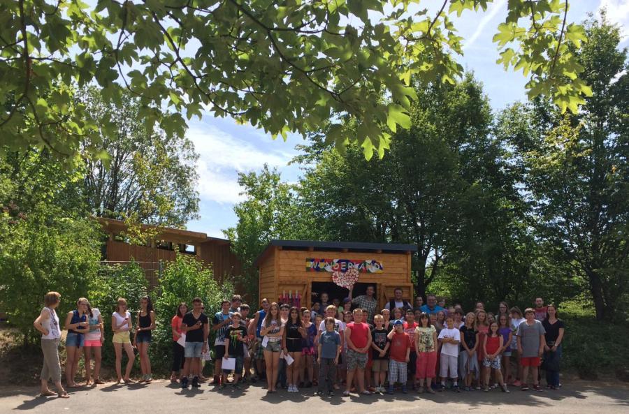 Bewegung mit vielfältigen Spiel- und Sportgeräten macht Spaß. Für die gebundenen Ganztagsklassen an der Mittelschule Heuchelhof wurden daher abwechslungsreiche Geräte angeschafft. Doch wohin mit den Minifahrzeugen, Bällen, Seilen, Pedalos und vielem mehr? Die Ganztagsklasse 7g ergriff mit ihrem Lehrer Peter Landeck die Initiative, in Projektarbeit eine Holzhütte mit Unterstützung der Zimmerei Dümler selbst zu bauen. Die Schüler und Schülerinnen der 7g fertigten den Aushub, errichteten die Rahmenkonstruktion, strichen die Bretter und verschraubten diese. Nicht nur die beiden Zimmerleute der Firma Dümler halfen, auch Eltern der 7g, Lehrkräfte und sogar Rektor Kellner selbst legten Hand an. Das Bauprojekt wurde von der Regierung von Unterfranken sowie „Praxis an Mittelschulen“ und dem Referat „Kulturelle Bildung“ am Staatsministerium finanziell gefördert. Am 22. Juli war dann die feierliche Einweihung und man bedankte sich bei Herrn Dümler. Mit der Spielgerätehütte setzt die Mittelschule Heuchelhof ein bewusstes Zeichen für ihre zukünftige Pausenhofgestaltung, die die ganze Schulfamilie im kommenden Schuljahr weiter angehen möchte. Denn Leben und Lernen im Ganztag macht erst besonders in einem naturnahen, mit unterschiedlichen Aufenthaltszonen gestalteten Schulgelände Spaß.