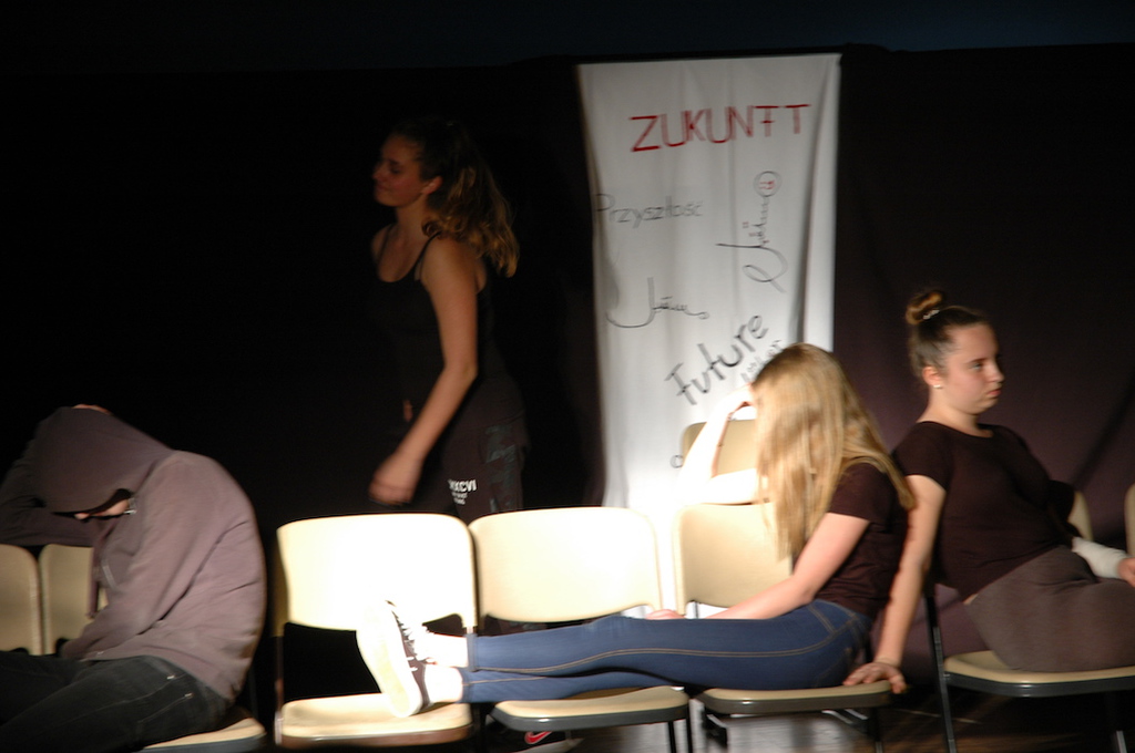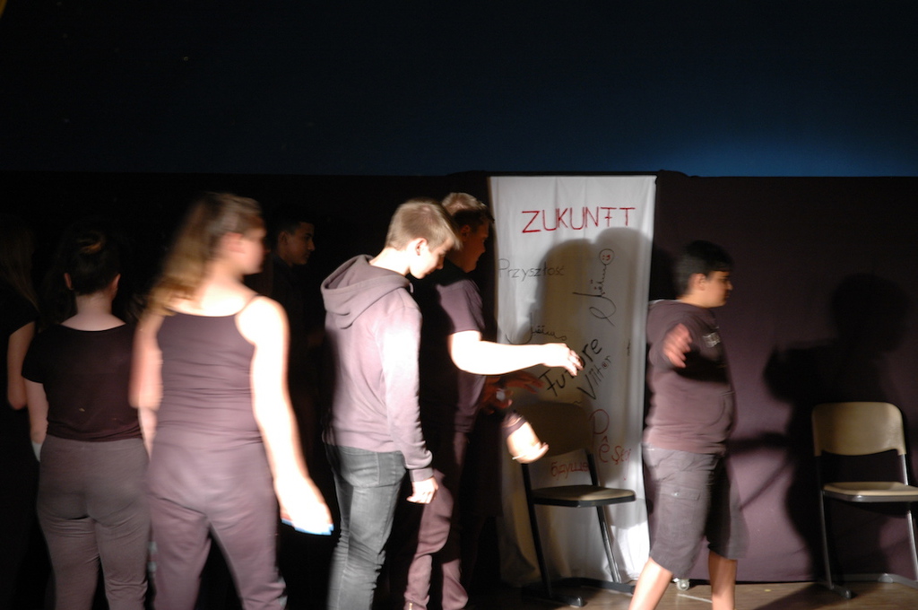 Daniela kam dann zu uns, um mit uns gemeinsam Ansätze zu erarbeite, wie wir selbst diesem Irrsinn entgegensteuern können. In einer ersten Doppelstunde machten wir uns erstmal Gedanken über Systeme und ihre eigene Wirkungsweise. Wir spielten selbst Systeme nach. Erfuhren am eigenen Leib, was passiert, wenn einer aus dem System ausschert. Wir definierten den Unterschied zwischen Kapitalismus und Sozialismus und stellten die verschiedenen Schichten in einer kapitalistischen Gesellschaft in Standbildern nach. Was sind die Folgen des Kapitalismus? Was bringt das alles mit sich, bei uns in Deutschland und auf der ganzen Welt? Das wurde nun durch verschiedene Texte und passenden theatralen Übungen verdeutlicht. Die erste Doppelstunde endete damit, dass wir viele Bilder zu diesem Thema gemeinsam in eine logische Reihenfolge, in ein System, gebracht haben.