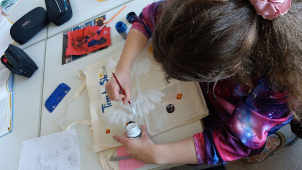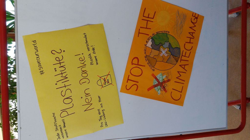 Die Zeit ging rasend schnell vorbei und am Ende hatten wir unsere Gedanken, was wir nun selbst tun könnten, noch nicht formuliert. Aber unsere Köpfe waren voll mit Gedanken und wir haben das Thema in der folgenden Woche im Unterricht mit unserer Klasse weiterbearbeitet. Quasi als „Klassen-Challenge“ haben wir uns nun vorgenommen, auf Plastiktüten beim Einkauf zu verzichten. Nach Ostern wollen wir dazu unsere Erfahrungen in Berichten niederschreiben. Erste Aufrufe zum Thema „Jute statt Plastik“ haben wir verfasst. Unsere Mitschüler sind mit drei, von uns erstellten Plakatwänden, über das Thema informiert worden. Und natürlich hat sich jeder von uns im Kunstunterricht einen schicken Stoffbeutel bemalt.