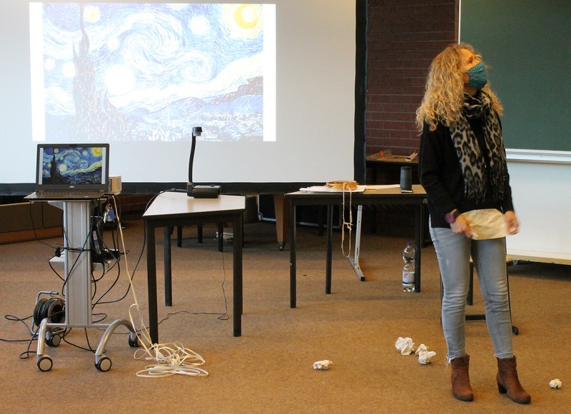 Als LTTA-Klasse (Learning through the Arts) nahmen wir diesen Tag zum Anlass, uns in besonderer Weise einer Geschichte zu nähern. Dazu arbeiteten wir mit der Schauspielerin, Regisseurin und Theaterpädagogin Daniela Scheuren. Sie kam an diesem Tag mit dem Buch „Die Sternennacht“ des Japaners Jimmy Liao in unsere Klasse. Natürlich las sie uns das Buch an diesem Vormittag auch vor, aber erst ganz am Ende. Vorher machte Daniela uns mit verschiedenen theaterpädagogischen Übungen neugierig auf das Buch. Einmal aufgewärmt durch ein paar auflockernde Spiele, ging es mit Wörtersammlungen zu verschiedenen Themen aus dem Buch und Standbildern weiter. Auch die vielen farbintensiven Bilder aus „Die Sternennacht“ kamen immer wieder zum Einsatz, um uns in die Gefühlswelt der Hauptfiguren einzuführen. So vorbereitet lauschten wir dann alle gebannt Danielas Vortrag der Geschichte.